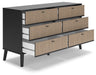 Put a retro spin on current trends with this dresser. Its mixed-material look of matte black and replicated beige cane brings a casually cool feel to your bedroom. Simple, sleek hardware and splay legs round out the urban meets mid-century vibe.