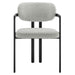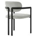 Infuse your dining or living space with the modern sophistication of the Elio Dining Chair. Combining angular metal framing with a rounded barrel chair design, this open back dining chair is a harmonious balance of geometry and softness. Its powder-coated metal frame features clean lines and a sculptural silhouette, while the padded seat and backrest of this upholstered chair are covered in a richly textured woven fabric for a tactile, cozy feel. Better for you and the environment, the upholstery fabric is also OEKO-TEX� STANDARD 100 certified. The open-back design adds an airy elegance, making Elio equally suited as a dining chair, accent chair, or office chair. Fully assembled and equipped with adjustable non-marking floor glides, this modern barrel chair ensures hassle-free setup and floor protection. Whether placed in a contemporary dining room, a cozy breakfast nook, or a stylish workspace, the Elio Dining Chair makes a statement with its modern charm and versatile design. Weight Capacity: 300 lbs.
