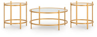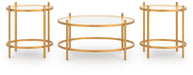 Details Includes coffee table and 2 end tables, Made with tubular steel frame, Durable metallic goldtone powder coat finish, Inset tempered glass top