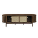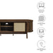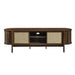 Introducing the Reid 61� TV Stand, which perfectly marries mid-century modern design with practical utility. This TV stand cabinet flaunts a distinctive oval shape and is covered in smooth laminate for a polished look. Synthetic rattan sliding doors glide to reveal spacious side compartments, perfect for storing various media devices, complemented by an adjustable center shelf that enhances storage flexibility. The leg design is a standout, extending from top to bottom with a subtle curve that adds stylish flair and robust support to the frame. Additional legs below reinforce stability and ensure an even distribution of weight. Complete with non-marking foot glides and three cable management holes, the Reid TV Media Console ensures your setup is both tidy and stylish. Accommodates flat-screen TVs up to 68 inches, assembly required. Weight capacity: 192 lbs.