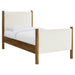 A perfect blend of cozy texture and craftsmanship, the Maven Twin Size Platform Bed brings a stylish focal point to any bedroom. The upholstered headboard and footboard, padded and covered in soft boucle fabric, provide a warm, inviting backdrop framed by robust solid wood posts for a touch of timeless elegance. Designed with wooden slats that support your mattress while promoting airflow, this platform bed eliminates the need for a box spring. Ideal for compact spaces, kids' rooms, or guest accommodations, the Maven Boucle Twin Bed combines a modern look with practical functionality, making it an excellent choice for those seeking both comfort and durability. Weight Capacity: 794 lbs.