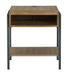 Beautiful to behold, this urban contemporary end table is loaded with high style and convenience. The wood sports a light, natural-looking finish that provides a dramatic contrast to the black metal frame. Its open cubby is perfect for stowing away books and magazines. A cleverly placed AC/USB charging port on the top lets you power up without moving a muscle.