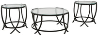 Details Includes coffee table and 2 end tables, Metal base in black finish, Clear tempered glass tabletop with beveled edge, Assembly required