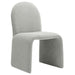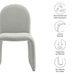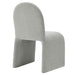 A harmonious blend of modern elegance and sleek design, the Junia Armless Dining Chair captivates with its sculptural silhouette and soft, textural allure. Featuring a rounded arch high backrest and a continuous frame with a waterfall edge, this inspired slipper dining chair is fully padded and upholstered in boucle fabric, offering a tactile charm and inviting comfort. Made from recycled plastic bottles, the upholstery fabric is also OEKO-TEX� STANDARD 100 certified. The gentle curves and armless design make it a sophisticated addition to dining rooms, living spaces, office desks, or bedrooms. Equipped with non-marking floor glides and arriving fully assembled, this upholstered dining chair effortlessly balances style, comfort, and practicality for a refined yet versatile seating option. Weight Capacity: 300 lbs.