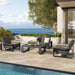 Unwind in sculptural sophistication with the Lirienne 4-Piece Outdoor Furniture Set, designed for modern outdoor living. This sleek patio conversation set includes two patio chairs, an outdoor loveseat, and a matching coffee table, both crafted from durable powder-coated aluminum for lasting durability and a modern aesthetic. The deep, angled seat and plush foam cushions on the sofa and chairs offer comfortable support, while the slatted coffee table provides a sturdy, quick-drying surface for drinks, snacks, and d�cor. Whether placed on a sun-drenched deck or a shaded patio, this aluminum patio furniture set enhances any alfresco space with contemporary elegance. Loveseat Weight Capacity: 501 lbs. | Table Weight Capacity: 199 lbs.