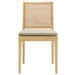 Bring a mix of farmhouse charm and modern design to your dining area with the Ovard Rattan Dining Chair. This elegant side chair features a solid elm wood frame paired with a natural rattan mesh backrest to bring modern farmhouse style and a coastal airy feel to your living or dining space. The padded fabric seat cushion is both removable and secured with charming ties, offering comfort and flexibility. Its streamlined armless chair design is ideal for dining tables, vanities, or as a contemporary desk chair. Non-marking floor pins protect your floors, and the rattan dining chair arrives fully assembled for hassle-free setup. Weight Capacity: 300 lbs.