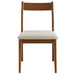 Update your dining decor with the modern allure of the Thera Set of 2 Rattan Dining Chairs. Crafted with a durable rubberwood frame, these wood dining chairs seamlessly blend retro design with modern aesthetics, making them a stylish choice as dining table chairs or kitchen table chairs. Featuring vegan leather seats and breathable rattan cane backs, the Thera mid-century modern dining chairs provide an inviting mix of textures and materials. The arms on each rattan chair are wider at the back and taper toward the front, creating a dynamic, angled design that enhances both the visual appeal and the ergonomic comfort of the chair. The legs are designed with a striking A-frame design, splaying outward for added stability and contributing to the contemporary dining chairs' geometric aesthetic. Whether placed around a dining table or used as faux leather accent chairs in the living room, the Thera cane dining chairs bring modern flair to any setting. Assembly required. Weight Capacity: 507 lbs.